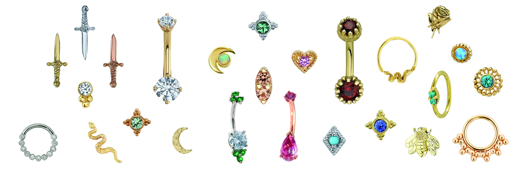 A wide variety of solid gold piercing jewelry like rings, ends, curved barbells & more…