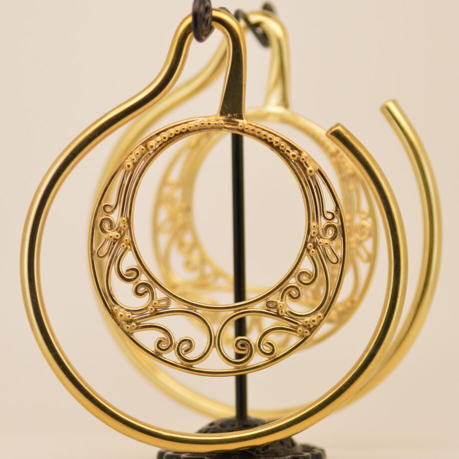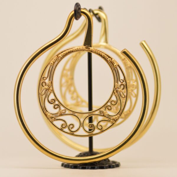 The Filigree Crescent Ear Weight is a sophisticated piece that is sure to add panache to your collection of ear jewelry. The brass weight is plated with 18kt gold for a handsome finish and features filigree ornamentation inside its center, vaguely reminiscent of a crescent moon. Overall, the ear weight measures approximately 84mm long by 76mm wide; it has a 4mm thick hook that is able to fit piercings stretched to 4mm and up. Can also be worn in bigger stretched earlobes, perfect to combine with Kaos Skin Eyelets.