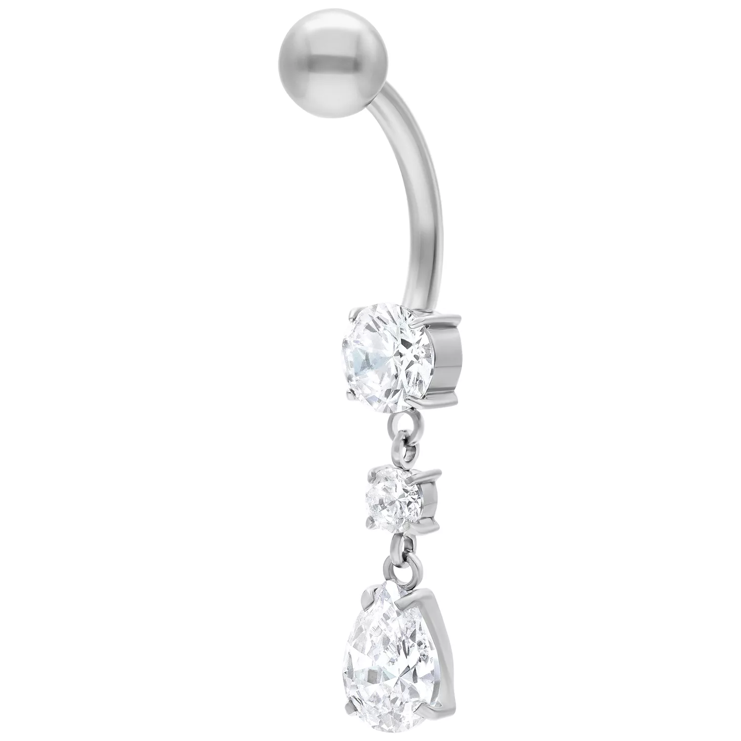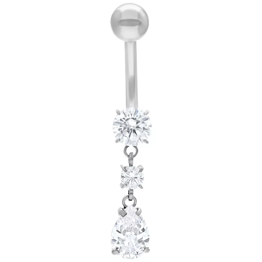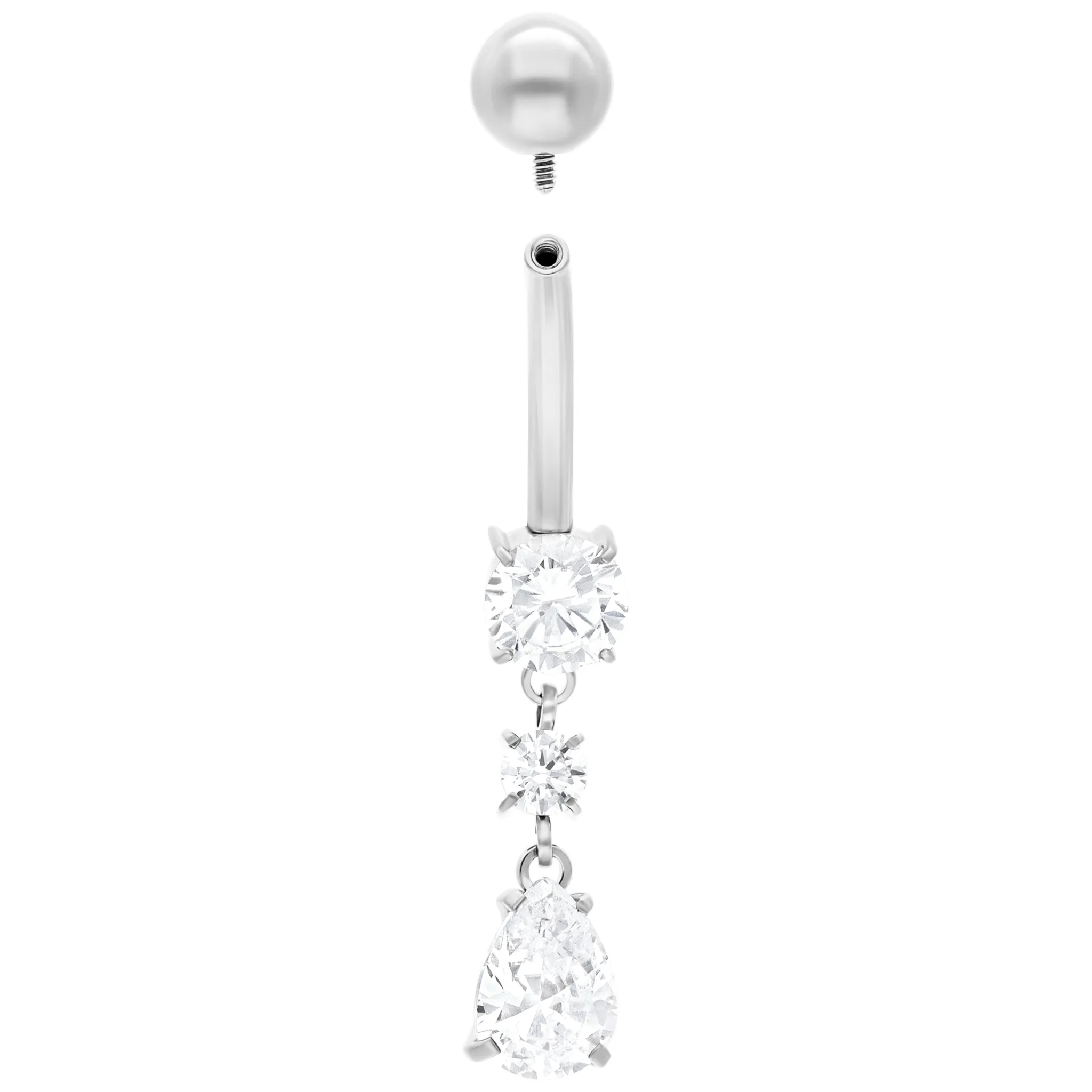The Crystal Drop belly button stud is made of high-quality titanium and has several beautiful, sparkling stones. The piercing is rounded off by a round and a drop-shaped gemstone, which are attached to the lower crystal ball. The design elements have overall dimensions of 5.0 x 19.0 mm.